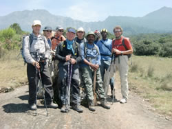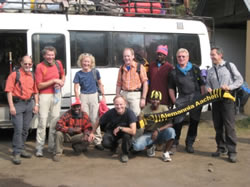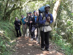 Da alle aus unserer Gruppe am Vortag eine bemerkenswerte Leistung vollbracht haben - 4 haben einen neuen persönlichen Höhenrekord erzielt - wichtiger aber noch, dass alle an ihre persönlichen Grenzen herangegangen sind bzw. sie überschritten haben, sind wir guter Stimmung. Nach dem Frühstück verabschieden wir uns von der Crew, die schon vor uns den Mt.Meru verlassen wird. Danach beginnen wir im gemütlichen Tempo und noch einmal die vielen Naturschönheiten am Mt.Meru genießend den Abstieg. Viele Male bestaunen wir den Kilimandscharo, der immer wieder zwischen den Bäumen und über den Wolken majestätisch über der Ebene thront. Nach einem Zwischenstopp 1.000m tiefer in der Miriakamba Hütte gehen wir weitere 1.000Hm abwärts.