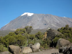 Mit dem durch Charly vorgegeben richten d.h. langsamen Tempo kommen wir stetig höher. Schon bald verlassen wir schlagartig den Regenwald und treten ein in die nächste Vegetationszone - das Hochmoor. Der jetzt niedrigere Baum- und Buschbestand in Verbindung mit dem fast wolkenlosen Himmel, gibt uns erstmalig einen grandiosen „Doppelblick" sowohl auf den weiß leuchtenden Kibo-Gipfel als auch auf den zerklüfteten Mawensi frei. Bei angenehmer Temperatur, es sind inzwischen etwa 20°C, ziehen wir unseren gut befestigten Weg stetig ansteigen zur Horombo-Hütte hoch. Es kommen uns bald viele Gruppen von oben entgegen, die am Vortag den Kilimandscharo bestiegen haben. Wir gratulieren ihnen und fragen neugierig nach den herrschenden Wetterverhältnissen. Übereinstimmend hören wir, dass es sehr kalt war - einigen sagen -15 bis - 20°C - und dies auch infolge starken Windes.