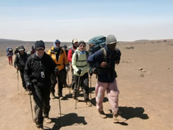 Wie meist an den Vortagen, geht es um 08:00h gut gelaunt bei noch kühlem aber sonnigem Wetter und ausgestattet mit der für diese Höhe normalen Sauerstoff- und Pulswerten los. Nach einem heftigen Anstieg gleich zu Beginn erreichen wir eine lange nur sanft ansteigende „Gerade", die gleich den Blick auf den Kibo freigibt. Hier erreichen wir die nächste Vegetationszone, die Hochwüste mit nur spärlichem Bewuchs durch vereinzelte Flechten und Steingewächse. Unsere morgige Aufstiegsroute zum Gilmans-Point rückt immer näher in unser Blickfeld und lässt Einzelheiten immer deutlicher erkennen. Hier kann sich jeder von uns schon einmal - zumindest geistig - auf die kommende Gipfelnacht ein wenig einstellen.