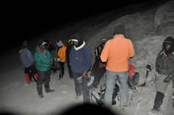Wie häufig bei Gipfeltagen üblich, beginnt der „Tag" schon in der vorhergehenden Nacht. Um 23:00h werden wir geweckt, wobei die meisten von uns gar nicht oder nur sehr wenig geschlafen haben. Offensichtlich haben wir schon eine Menge Adrenalin im Blut im Hinblick auf den vor uns liegenden Tag. Etwas fröstelnd, nach einem „mageren" Frühstück, bestehend aus Porridge, Biskuits und Tee oder Kaffee sind wir um 00:10 bei mondklarer Nacht, fast Windstille und relativ warmen 10°C Außentemperatur abmarschbereit. Wir sind insgesamt 13: wir 7, der Ranger Frederik, der afrikanische Führer Yohana, ein Träger für den Medizinkoffer und 3 weitere Träger zur besonderen Verfügung. Nahezu wortlos begeben wir uns auf das 1. noch flache Stück auf den Anstieg zum Rhinopoint. Dieser hat seinen Namen daher, weil vor langer Zeit ein Jäger auf diesem 3.800m hohen Berg ein Rhinozeros erlegt haben soll. Der „Rhino" erfordert bereits erhebliche Kräfte. Vor allem das letzte steile Stück geht durch Feinstaub in endlosen Zick-Zacks. Nach genau 1:48h erreichen wir diese erste Wegmarke auf unserer Route.