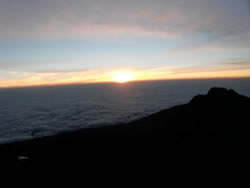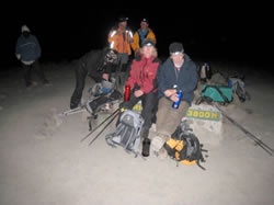 Oberhalb der 4.000 m Marke, gehen wir jetzt allmählich an die körperlichen Grenzen heran. Bei 4.100m - immer im Wechsel zwischen einigermaßen gut begehbarem Pfad und Felspassagen - mißt unsere Doc die Sauerstoff- und Pulswerte aller. Die Sauerstoffsättigung ist deutlich gefallen und die Pulswerte gestiegen. Da die Werte aber medizinisch noch nicht bedenklich sind, entscheiden wir gemeinsam, weiter zu steigen. Im Osten sehen wir bereits eine erste Rötung am Horizont als sicheres Zeichen für den anbrechenden Tag. Bis zur Höhe von ca. 4.250 m nehmen wir nochmals alle Kräfte zusammen. Bei einer windstillen Stelle, diesmal am inneren Kraterrand, halten wir an und erneut mißt der Doktor Sauerstoffsättigung und Pulsfrequenz. Bei einigen sind diese Werte nun so, dass ein weiterer Aufstieg nicht sinnvoll ist. In gemeinsamer Entscheidung legen wir daraufhin fest, dass 3 Teilnehmer unserer Gruppe zusammen mit Yohana, dem Doktor und 2 der übriggebliebenen Träger den Rückmarsch antreten. Es ist ca. 05:30 und alle haben eine bravouröse Leistung vollbracht und damit jeweils nicht nur einen persönlichen Höhenrekord von über 4.200m aufgestellt sondern ein unvergessliches Bergerlebnis gehabt, welches die Anstrengungen und Höhen und Tiefen einer Tour an solchen Bergen mit sich bringt. Alle sind in dieser Nacht über ihre bisherigen Grenzen gegangen. Morgens gegen 09:30h erreichen sie sicher die Saddle-Hütte auf 3.800m und sie alle sind stolz auf das Erreichte in der vergangenen Nacht.