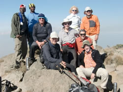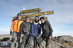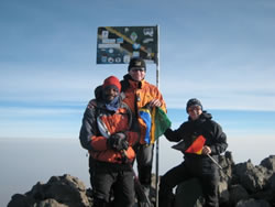 Die Überwindung der letzten Basaltblöcke geht fast automatisch und plötzlich stehen wir alle auf dem engen Gipfel-Plateau vor der windschiefen Holztafel mit der grüngelben Aufschrift „Gilmanspoint, 5.681m". Erschöpft aber glücklich fallen wir uns in die Arme und feiern uns selbst, unsere afrikanischen Begleiter, denken zurück an alle die Mühen, Trainingseinheiten, Zweifel und Hoffnungen, die uns mehrere Monate lang bis zu diesem Moment begleitet haben. Unsere Gedanken schließen unseren Kameraden ein, der so kurz vor dem Gipfel leider nicht