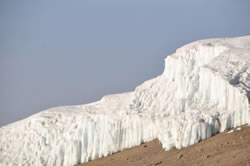 Die „4 Uhurupeaker" haben zu dem Zeitpunkt den besagten Peak, dem absolut höchsten Punkt Afrikas auf 5.896m erreicht. Nach den obligatorischen Fotos dort, haben sie noch Zeit, die umliegenden hochaufragenden Gletscher näher zu begutachten. Letzte wissenschaftliche Untersuchungen besagen, dass die Eiskappe des Kili bis ca. 2025 verschwunden sein soll - dies aber nicht als Resultat der Erderwärmung sondern durch Sublimation des Eises, welches nicht schmilzt sondern direkt als Wasserdampf in die Atmosphäre entweicht.