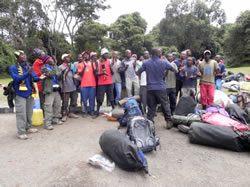 Zunächst bedanken wir uns bei den insgesamt 27 Guides, Assistant Guides, Köchen, Kellnern und Trägern für die sichere Führung und den guten Service während der gesamten Besteigung. Als Gegenleistung singen sie für uns den berühmten Kilimandscharo-Kanon und zum Schluss singen wir gemeinsam mit ihnen die tansanische Nationalhymne, die wir Deutschen in den Tagen vorher textlich, inhaltlich und melodiemäßig während unserer Pausen zumindest in Ansätzen gelernt haben. Zum Abschluss werden wir dann noch von der Crew zu einem afrikanischen Mittagessen mit gekochten Bananen, Beef und Avocado-Früchten eingeladen, was diese Kilimandscharo-Besteigung in einer besonders freundschaftlichen Stimmung beendet.