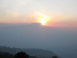 Einerseits sehen wir „hinter" dem little Mt.Meru die weite afrikanische Hochebene, vulkanischen Ursprungs mit kleinen, uralten Kratern und verschiedenen Seen. „Vor" dem little Mt.Meru - für uns von besonderem Interesse - sehen wir große Teile unserer morgigen Aufstiegsroute zum „großen" Mt.Meru. Diese prägen wir uns schon einmal ein, damit wir in der folgenden Nacht einigermaßen nachvollziehen können, wo wir gerade sind.