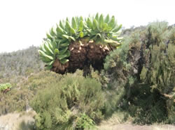 Auf unserem Weg weiter aufwärts sehen wir eine größere Anzahl der hier wild wachsenden Bromelien und Lubea sowie die inzwischen am Kili seltenen Senezien, palmartige Bäume, die aber zur Gattung der Kräuterpflanzen gehören.