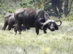 Nach weniger als 1 km Busfahrt nach der Registrierung direkt hinter dem Gate öffnet sich rechts des Weges eine große Lichtung, auf der sich eine ganze Reihe der hier lebenden Wildtiere zeigen: viele Zebras, eine größere Büffelherde, einige dazwischen laufende Warzenschweine, friedlich grasende Antilopen und weiter hinten einige Giraffen. Schnell findet sich für diese friedliche und beeindruckende Szene die treffende Bezeichnung „Garten Eden.“
